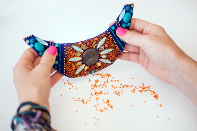 Da bi ste napravili jednu efektu ogrlicu, biće Vam potrebno više materijala, i savetujemo da napravite skicu po kojoj ćete raditi. Na taj način nećete napraviti grešku u radu. Od filca možete da iskrojite oblik, na koji ćete krenuti da prišivate ili lepite kamenčiće i kristale. Na obode možete staviti već gotove lančiće, kako bi prikrili ivicu filca a samo ogrlica delovaće punije. Pozadinu filca možete da obložite satenskom trakom, koja će ujedno i poslužiti da ogrlicu okačite oko vrata.